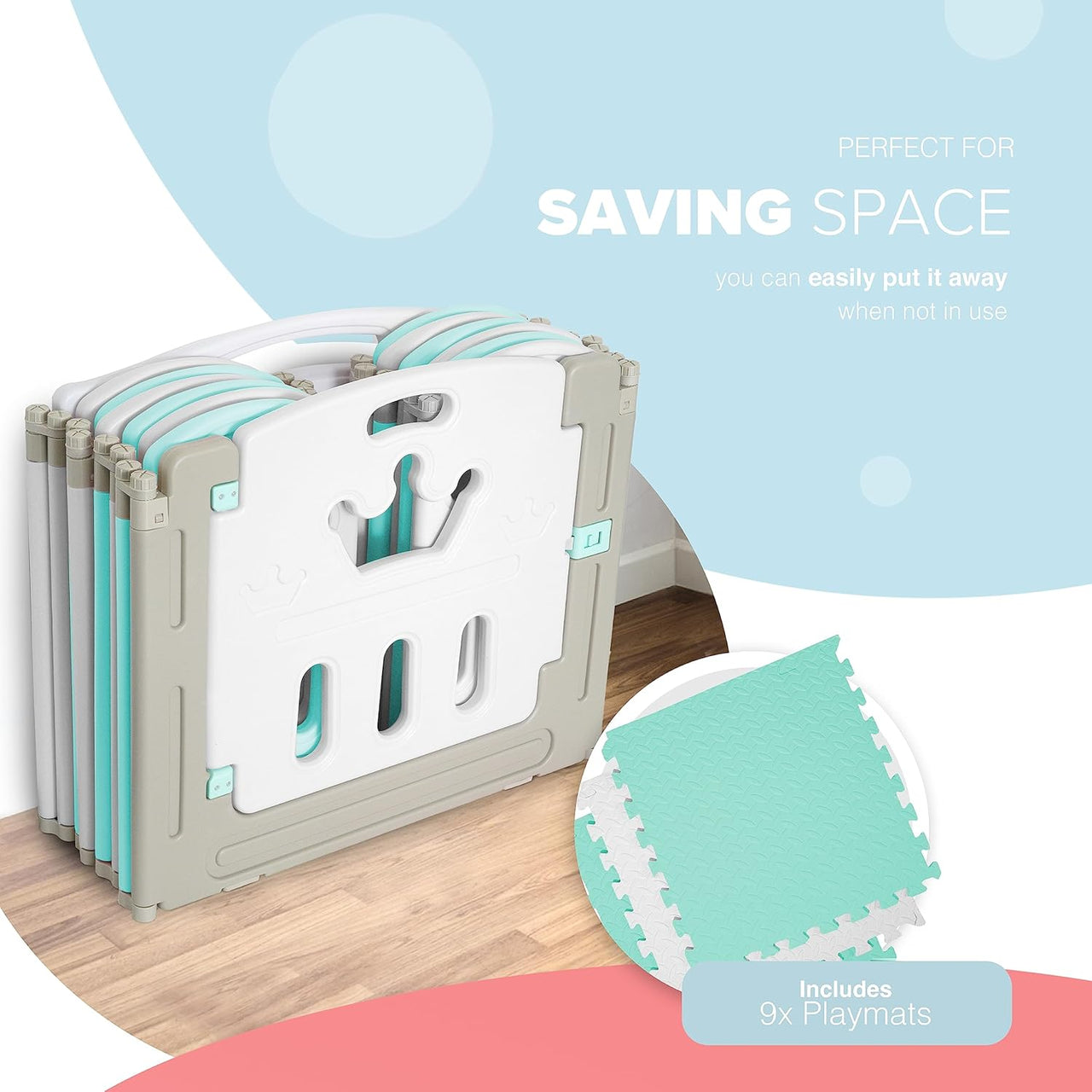 • Easy to assemble and relocate / Easy to lock safety gate panel / Comes with interlocking slip-resistant mats / Provides a safe space for your child to play for hours on end. (Supervision always recommended)